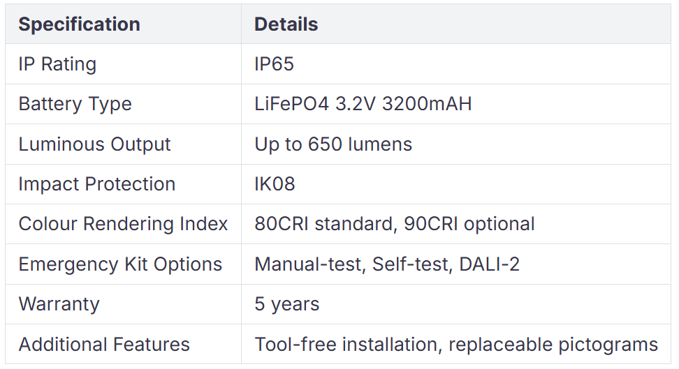 Nødflugtslys hjælper folk med at finde vej ud, hvis strømmen svigter, der er brand, eller der opstår en anden nødsituation. Belysningssystemet giver skarpt lys, så alle kan se flugtveje og være sikre. Flugtvejsbelysning er ekstra vigtig for børn eller personer, der ikke let kan bevæge sig. Nødflugtslys bruger stærke skotnødbeslag, der fungerer på barske steder.